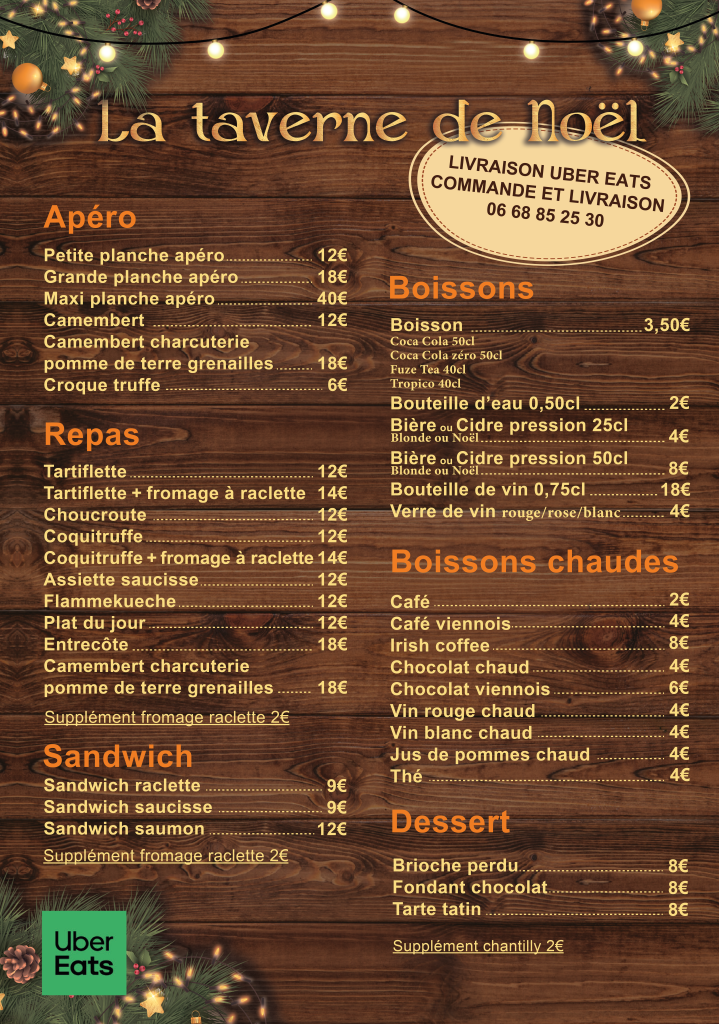 Envie de déguster nos plats chez vous, au bureau ou dans votre location de vacances ? La Taverne de Noël est disponible sur Uber Eats durant toute la période du marché de Noël.